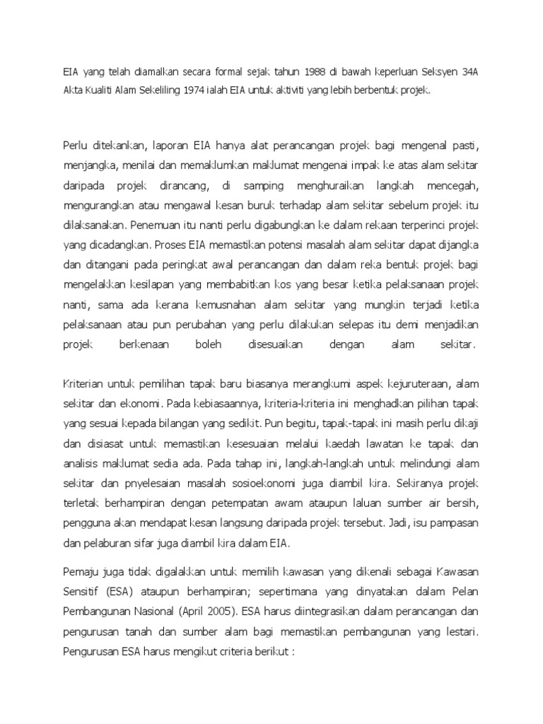 Eia Yang Telah Diamalkan Secara Formal Sejak Tahun 1988 Di Bawah Keperluan Seksyen 34a Akta Kualiti Alam Sekeliling 1974 Ialah Eia Untuk Aktiviti Yang Lebih Berbentuk Projek