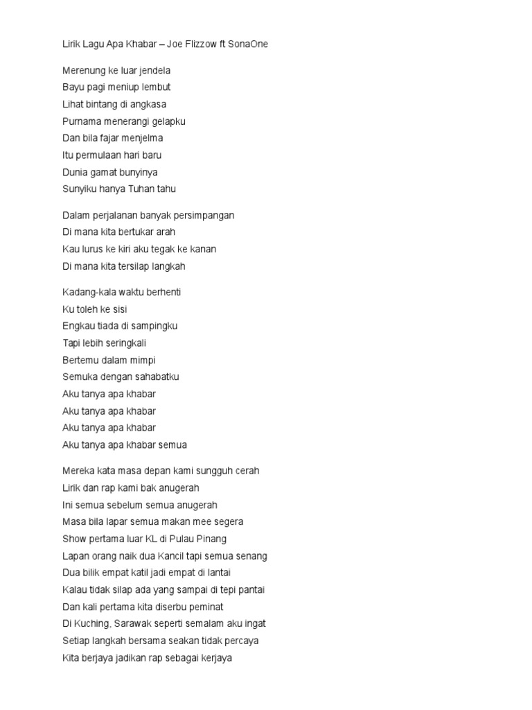 Lirik Joe Flizzow Feat Sonaone Apa Khabar Print Lyrics Pdf Document