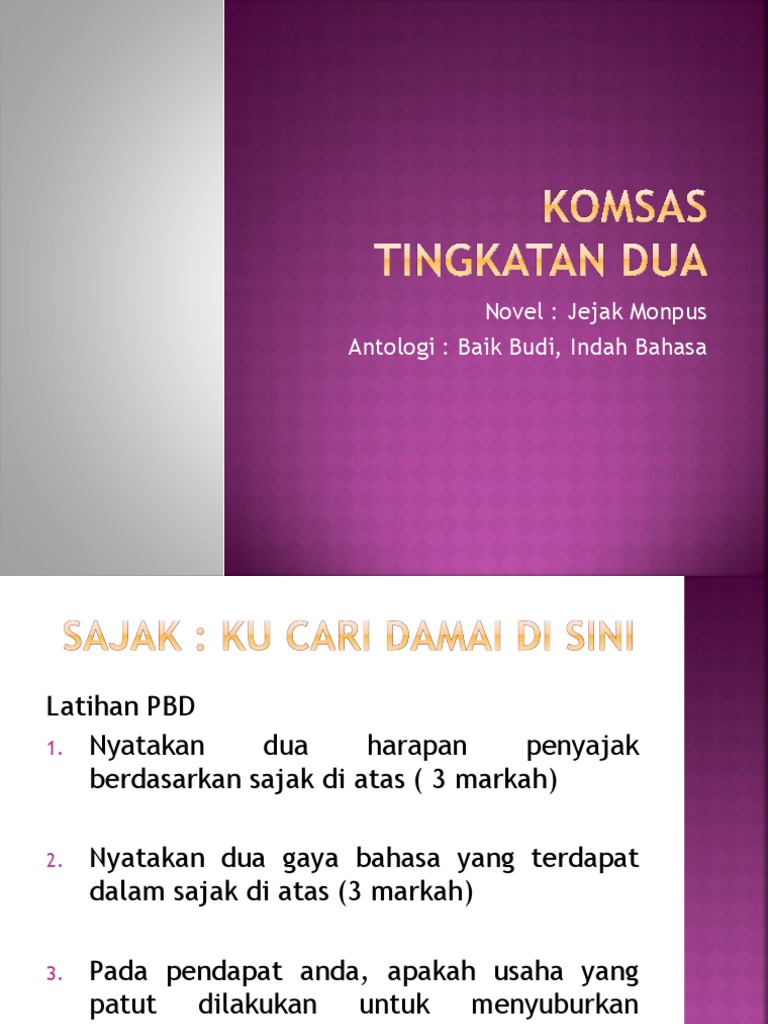 Komsas bahasa melayu. Suriani putri farah yusrina nadhirah banjir di mata emak banjir di mata emak perwatakan sinopsis persoalan tema gaya bahasa nilai pengajaran perwatakan perwatakan mak piah nana saya saya saya. 2016 menyaksikan penukaran teks antologi komsas tingkatan 2.