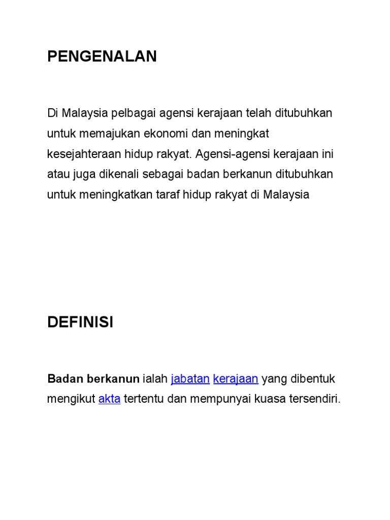 Apa itu badan berkanun di malaysia. Perbadanan awam di malaysia merupakan agensi separa kerajaan yang ditubuhkan untuk membantu jabatan kerajaan. Kategori glc terdiri daripada syarikat syarikat yang dikawal oleh kerajaan negeri masing masing dan agensi di peringkat negeri. Badan badan tidak berkanun ialah syarikat syarikat kerajaan yang ditubuhkan di bawah akta syarikat 1965 akta 125.