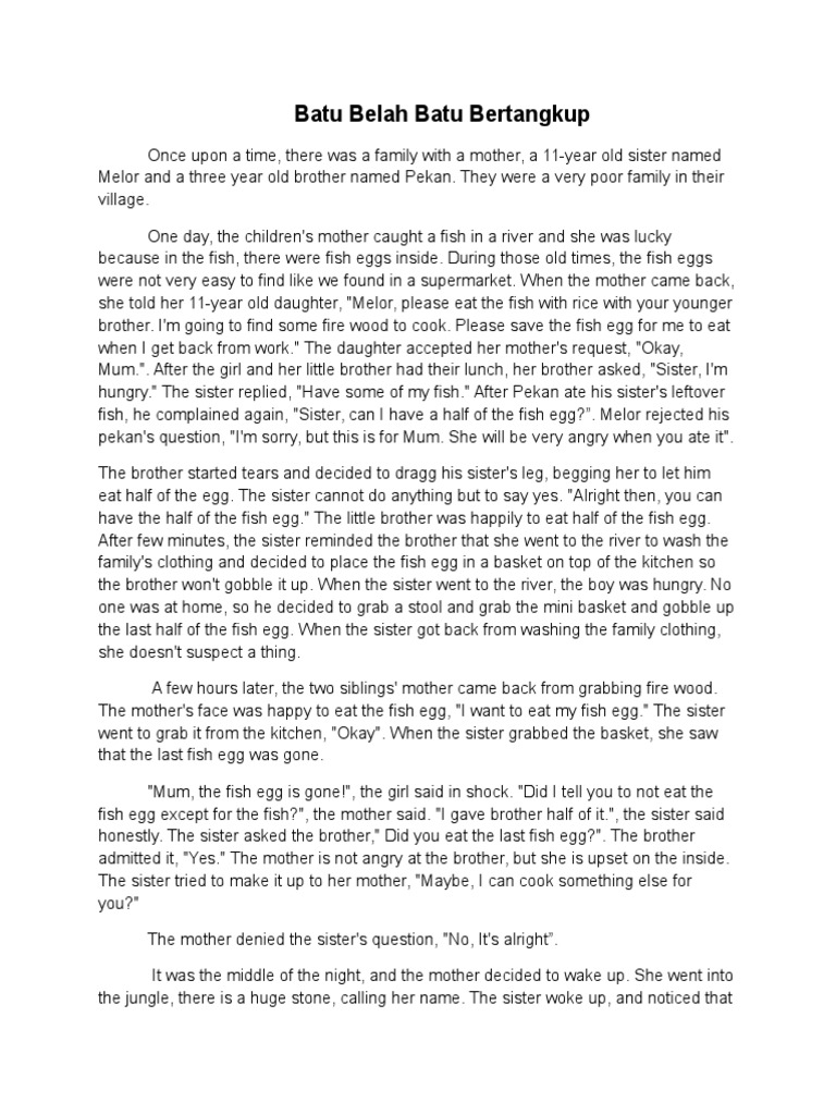 Kampong residents were sharing their stories with the berita harian journalists before they were to move out from the village that was due for demolishment. Batu belah batu bertangkup english version 1 see answer answers benbenzar43 helping hand. The conflict of the story is when the little boy asked her sister for additional fish and its egg again and again.