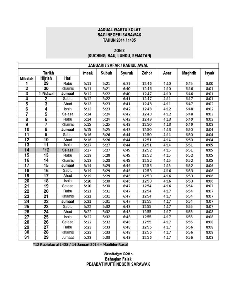 Jadual waktu solat bagi kawasan kuching bau lundu sematan dan kawasan yang sewaktu dengannya. Muat turun jadual waktu solat dan jadual waktu berbuka puasa bagi kawasan kuching bau lundu sematan dan kawasan yang sewaktu dengannya. Jadual waktu solat jumaat kuching solat jumaat ialah solat fardu dua rakaat yang dilakukan pada hari jumaat menggantikan solat zohor dan ia dilakukan secara berjemaah selepas mendengar khutbah jumaat.